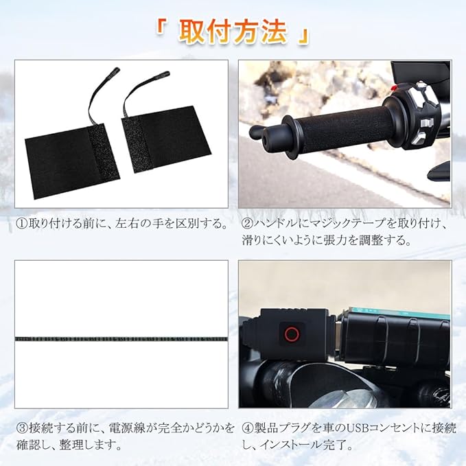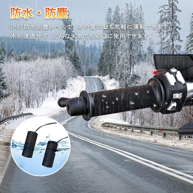 【IP67防水 水洗い可能】グリップヒーターはIP67防水レベルです。スイッチやハンドルカバーが水に濡れても正常に動作します。雪が溶けた後の製品の損傷の心配はありません。グリップヒーターを洗うときは、プラグを抜くだけで水洗いできるのでとても便利です。非走行時の通電作業(空焚き)は厳禁です。