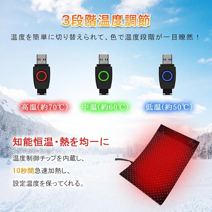 【10秒で急速加熱】ケブラー材質を採用し、加熱が早く、熱が均一に広がります。消費電力が低く、使用寿命も長いです。また、本製品は大発熱シートを採用しているので発熱面積が大きく、発熱速度が速いです。スイッチを入れ、電源接続後10秒程度で暖かくなり、寒い冬の屋外で手を温めます!