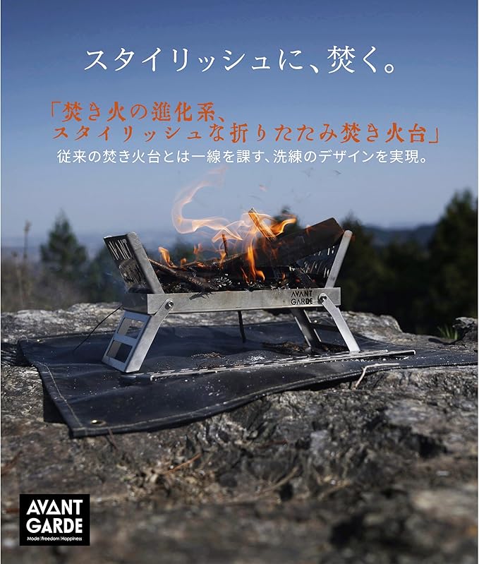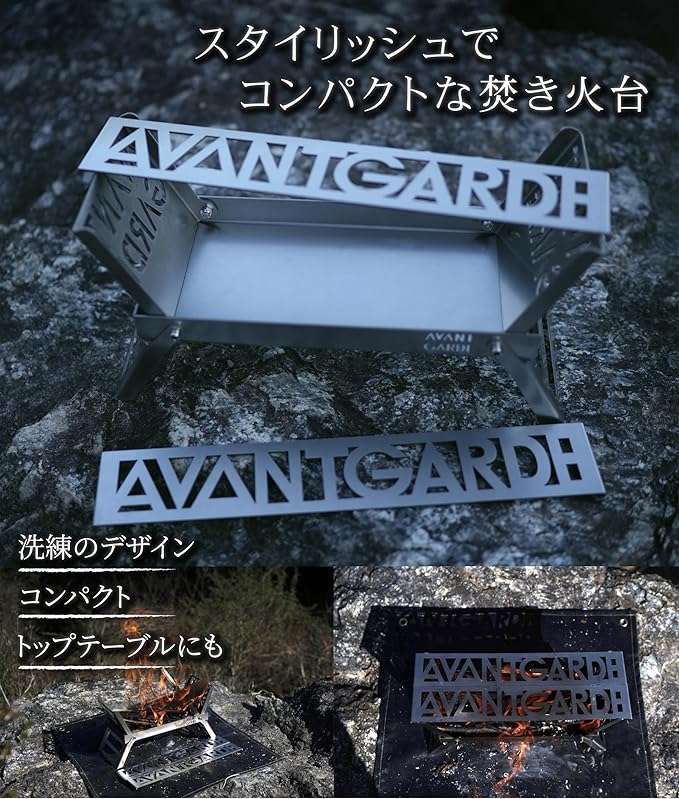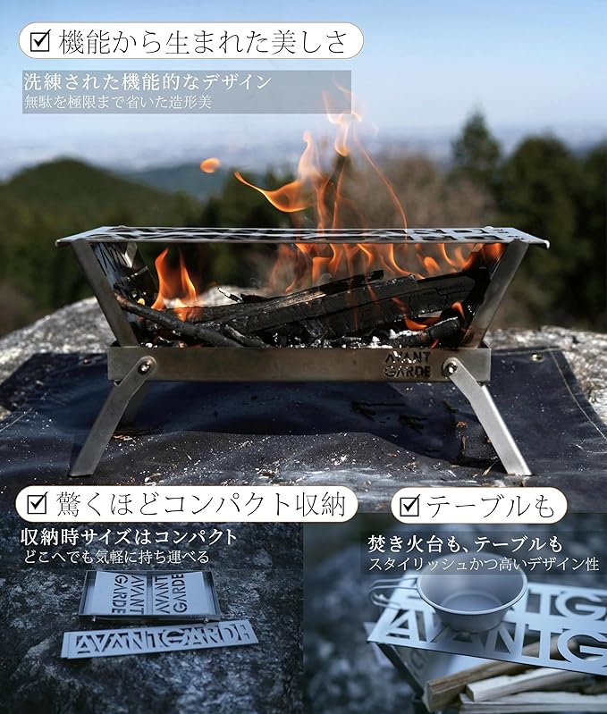 [AVANT GARDE] 焚き火台 折りたたみ ローテーブル兼用 3秒設営 超コンパクト ステンレスSUS304 厚み2mm 高耐久 錆びにくい 無骨デザイン ゴトク付き 収納袋付き 調理対応 簡単片付け 薪割り不要 ソロキャンプ ファミリー BBQ【スタイリッシュに、焚く】