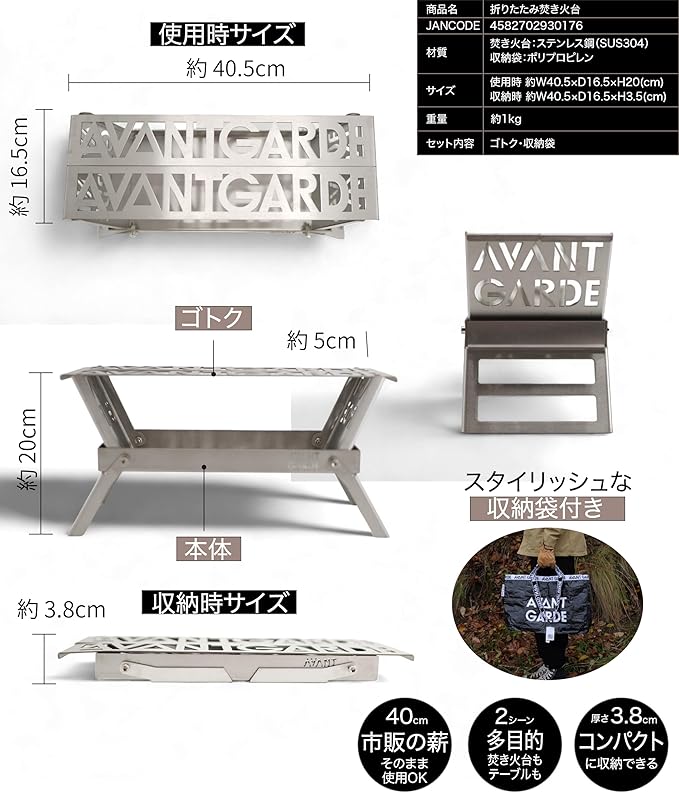 【美しい仕上げと無骨なデザイン】表面は磨き上げられたステンレスで、無骨ながらもスタイリッシュ。灰捨ても簡単、後片付けも楽々。機能美とデザインを両立した、AVANT GARDEならではの焚き火ギアです。【商品仕様】展開サイズ:W40.5 D16.5 H20.5cm、収納サイズ:W40.5 D16.5 H3.8cm、重量:約2.6kg、付属品:ゴトク・収納袋