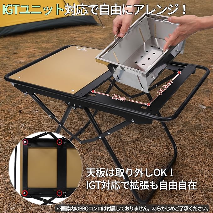 【IGT対応の拡張性高いテーブル】ユニフレームIGT規格に対応した天板構造で、他のIGTギアと組み合わせて自由にカスタマイズが可能。天板は取り外しでき、拡張や組換えも簡単。ソロからグループキャンプまで幅広く活躍。