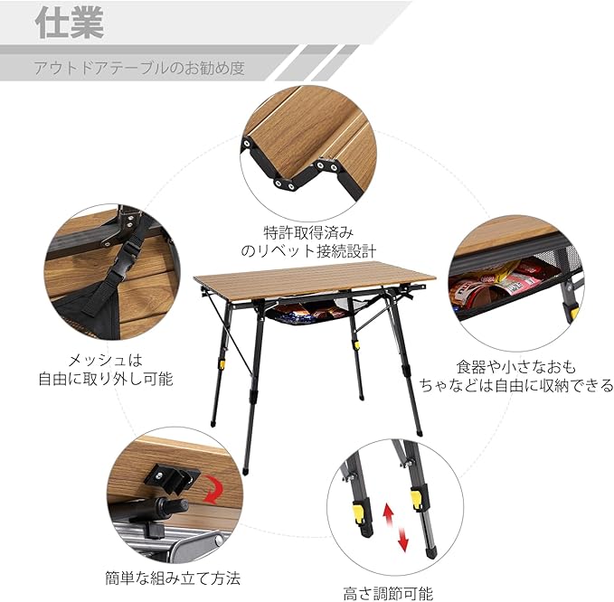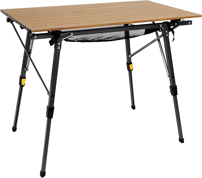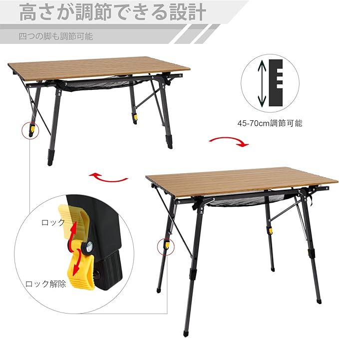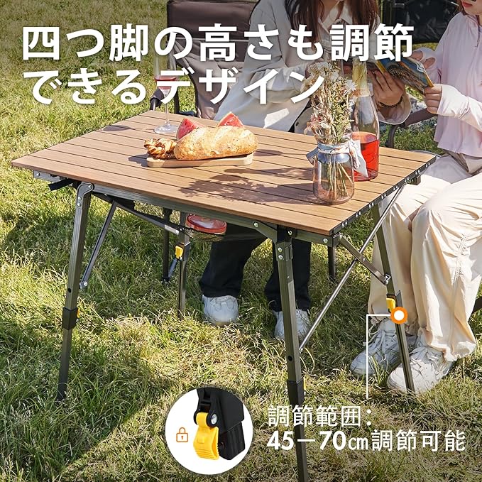 Timber Ridge アウトドアテーブル 折りたたみ 高さ調節 耐荷重30kg アルミ ロールテーブル 収納袋付き コンパクト キャンプ用 90L*53W*45-70Hcm 重量4.2kg 木色