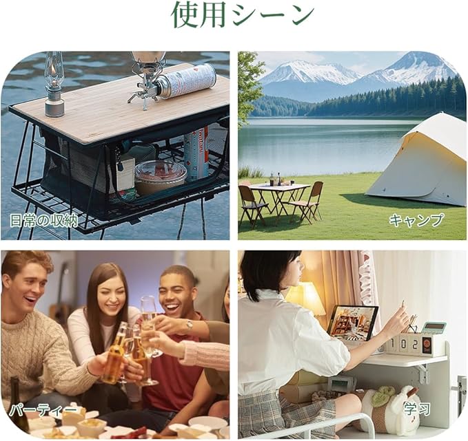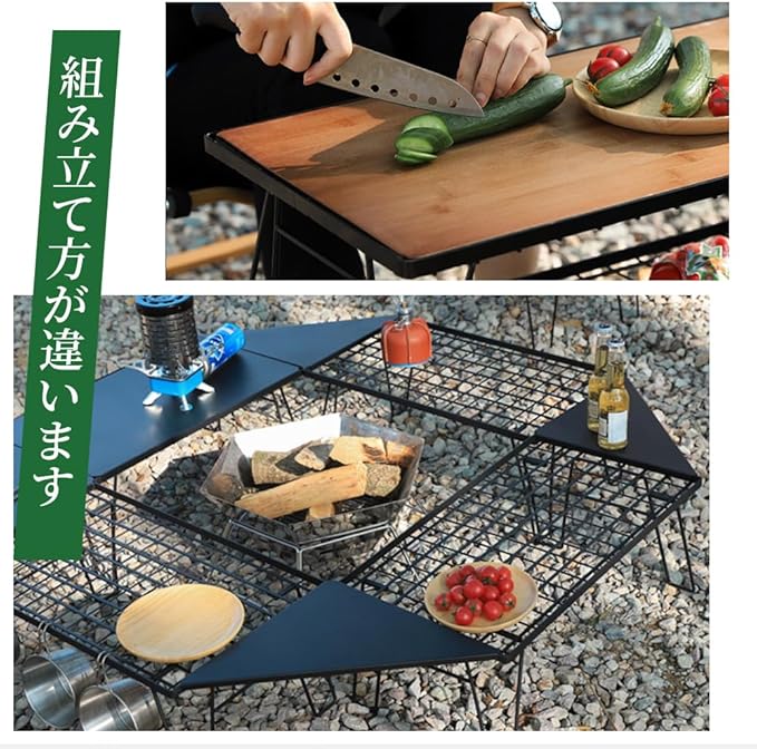 【アウトドアで大活躍】本製品はアウトドアでの飲み会やキャンプシーンに最適な多機能折りたたみテーブルです。食材の整理・収納機能を備えているだけでなく、耐熱性を活かしてバーベキューグリルとしてもご使用いただけます。コンパクトに折りたたむことができ、アウトドア活動の必需品として大活躍すること間違いありません。