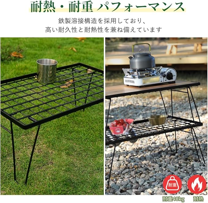【耐重 耐热】フレームは鉄製溶接構造を採用しており、高い耐久性と優れたデザイン性を兼ね備えています。さらに、耐熱加工を施すことで、フレーム全体に優れた耐熱性能を実現しています。30kgのクーラーボックスや電磁調理器を置いても、十分な強度を確保し、安全にご使用いただけます。