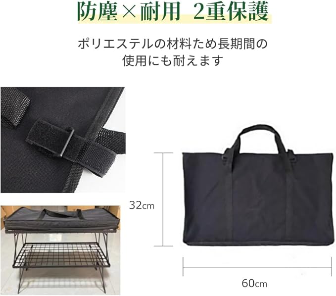 【収納袋付き】本製品には専用の収納袋が付属しており、便利性を高めています。また、ポリエステルの材料ため長期間の使用にも耐えます。さらに、収納袋の中に布の仕切りがあることで、フィールドラック本体をしっかりと保護します。