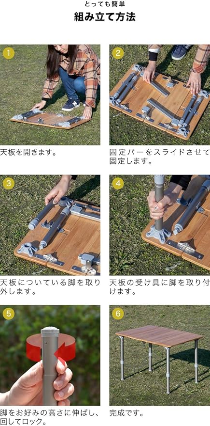 【四つ折り構造採用のテーブル】 テーブルを四つ折りにするという画期的な構造。二つ折りタイプよりコンパクトになるので移動に便利。広げて脚を伸ばすだけなので組み立ても簡単です。