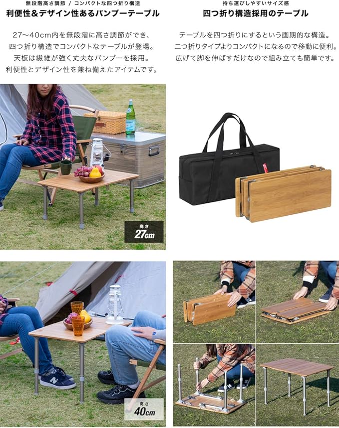【無段階高さ調節/コンパクトな四つ折り構造】 27~40cm内を無段階に高さ調節ができ、四つ折り構造でコンパクトなテーブルが登場。天板は繊維が強く丈夫なバンブーを採用。利便性とデザイン性を兼ね備えたアイテムです。