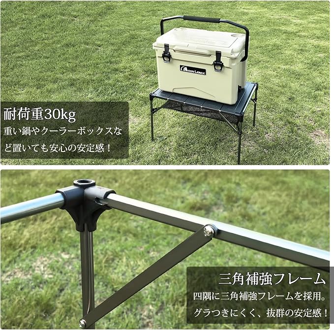 【30kg耐荷重&安定性抜群】厚みのある天板と、支柱四隅に三角補強フレームを追加し、最大耐荷重30kgを実現。重たいギアや調理器具もしっかり支える頑丈設計。