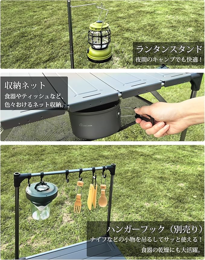 【収納力も◎|ランタンポール&メッシュネット付き】標準装備としてランタンハンガーと天板下メッシュラックを同梱。さらに別売のハンギングラックでDIY拡張も可能。キャンプギアをスマートに整理整頓!
