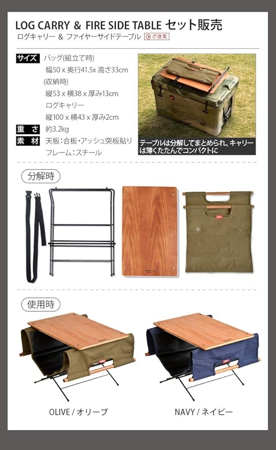 テーブルおよび薪台ともなるコンパクトなテーブル。オプションのログキャリーをテーブル下にセットすることで薪を収納でき、焚火横で薪をくべながらテーブルで調理したり、飲食したりできます。