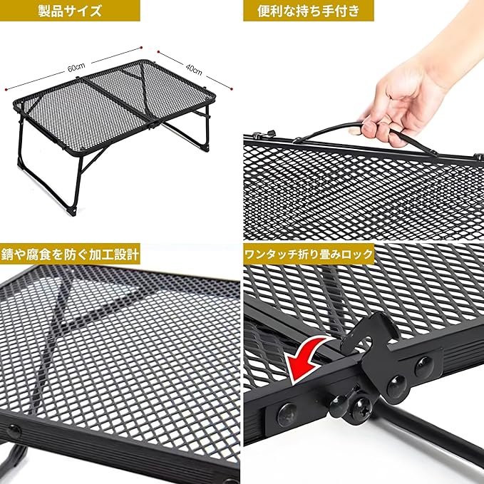 ✅ 【熱いものOK!頑丈なメッシュ構造】アウトドアで熱い鍋やグリルを置くとき、テーブルを気にしてしまうと不便ですよね。このテーブルはメッシュ構造なので、熱いものを直接置いても問題なし。飲み物をこぼしても水が溜まらず、サッと拭くだけでお手入れも簡単です。シンプルなデザインで使い勝手がよく、ソロキャンプから家族のBBQまで幅広く活躍します。タフに使えるテーブルを探している方にぴったりです。
