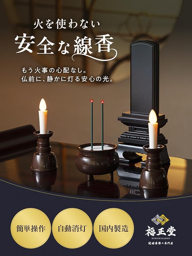 ✅葬祭のプロも推奨する信頼の品質 厚生労働省認定・葬祭ディレクター1級の神崎忍氏より推奨をいただいています。「ロウソクを灯し、線香をあげる事はとても大切です。ご先祖様と心を通わせる意味があります。この商品は、火を使いにくい場面でも安心・安全に使用でき、ご供養の機会を増やしてくれます。」信頼ある専門家の声が安心を後押しします。
