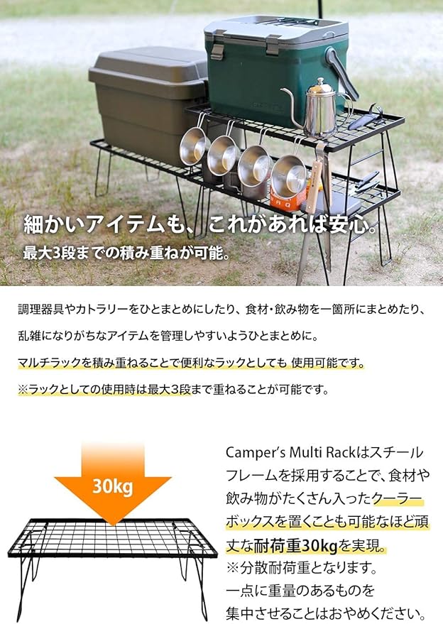 【細かいアイテムも、これがあれば安心】 最大3段までの積み重ねが可能。調理器具やカトラリーをひとまとめにしたり、食材・飲み物を一箇所にまとめたり、乱雑になりがちなアイテムを管理しやすいようひとまとめに。マルチラックを積み重ねることで便利なラックとしても使用可能です。※ラックとしての使用時は最大3段まで重ねることが可能です。 【マルチラックは耐荷重"30kg"】 クーラーボックスを置いても安心の耐荷重性能。キャンパーズマルチラックはスチールフレームを採用することで、食材や飲み物がたくさん入ったクーラーボックスを置くことも可能なほど頑丈な耐荷重30kgを実現。 ※分散耐荷重となります。一点に重量のあるものを集中させることはおやめください。