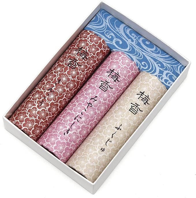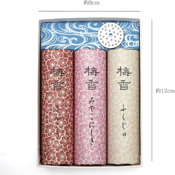 【仕様】寸法(外装)mm:約115 81 27(高) 内容量: 15本 4種 煙の量:少ない 燃焼時間:約15分 香り:梅をイメージした女性的な甘く華やかな3種の香り 素材:みやこにしき(タブ粉・バニラ、龍脳等) きんこう(タブ粉・イランイラン、麝香系、龍脳等) ふくじゅ(タブ粉・メントール、レモン、ベルガモット等) 製造国:京都
