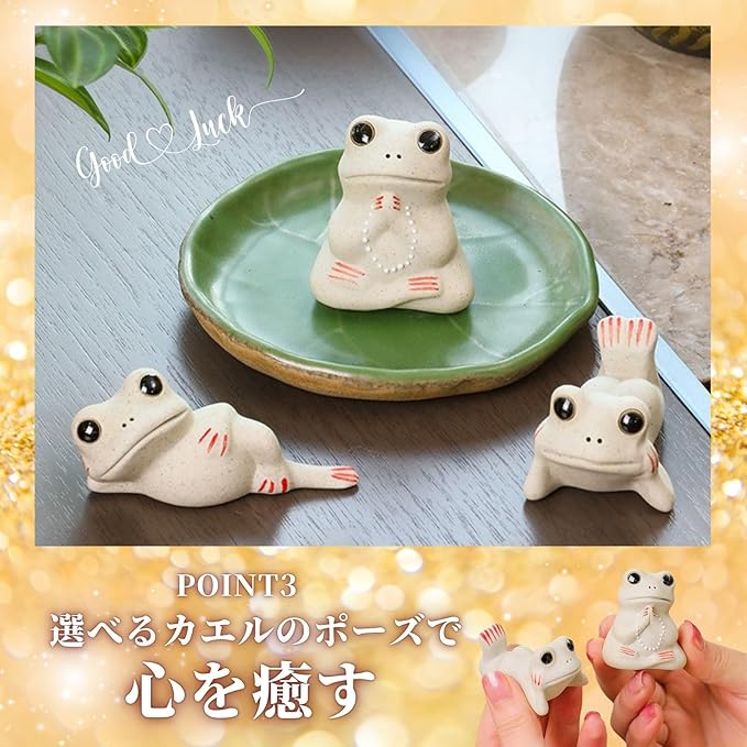 選べるカエルのポーズ: お祈りするカエル、横に寝そべる蛙、腹ばいのかえるの3種類からお好みのデザインを選べるので、自分用はもちろん、プレゼントにも最適。個性的なカエルが心を和ませます。特別な日のギフトとしてもどうぞ。
