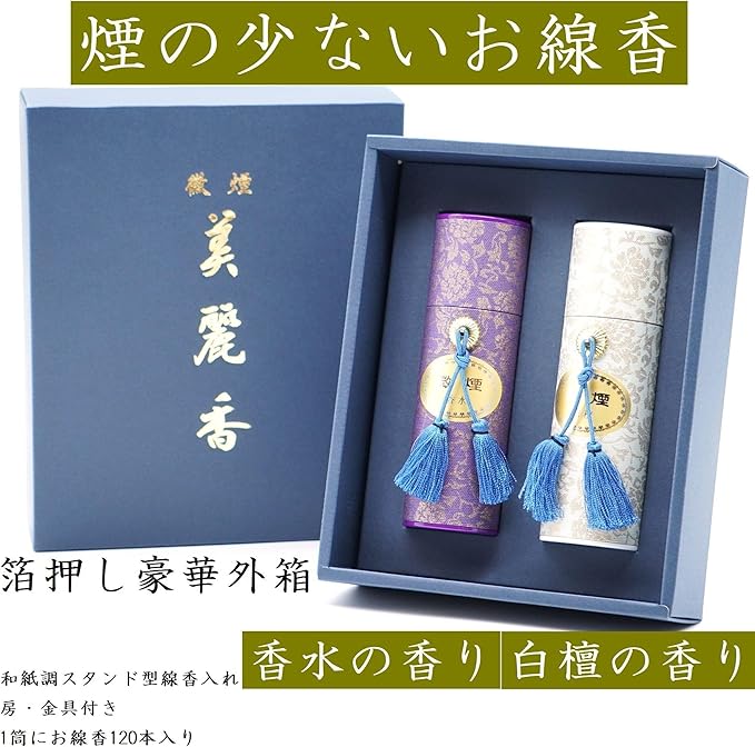 【美麗香二種香】お線香セット 煙の少ない微煙タイプ 白檀・香水の香り 包装・御供入り熨斗付き お盆・喪中・喪中御見舞・ギフト・進物・贈り物・贈答用線香【安心の国産 made in japan】 【創業文政三年永楽屋】