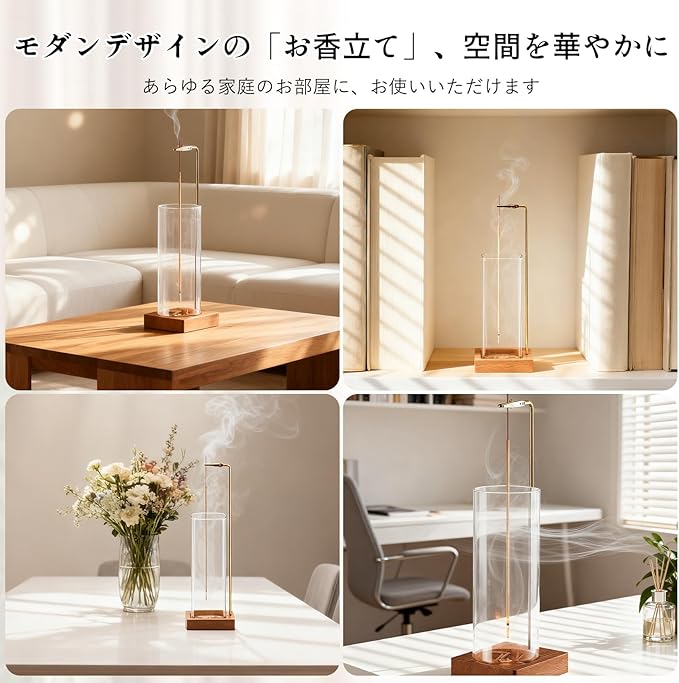 お香立て オシャレ [灰飛び防止] ガラス製 可愛いデザイン 香炉 線香立て キャンドルホルダー兼用 長香対応 天然木 インテリア 仏壇 寝室 玄関 書斎 瞑想 ギフト