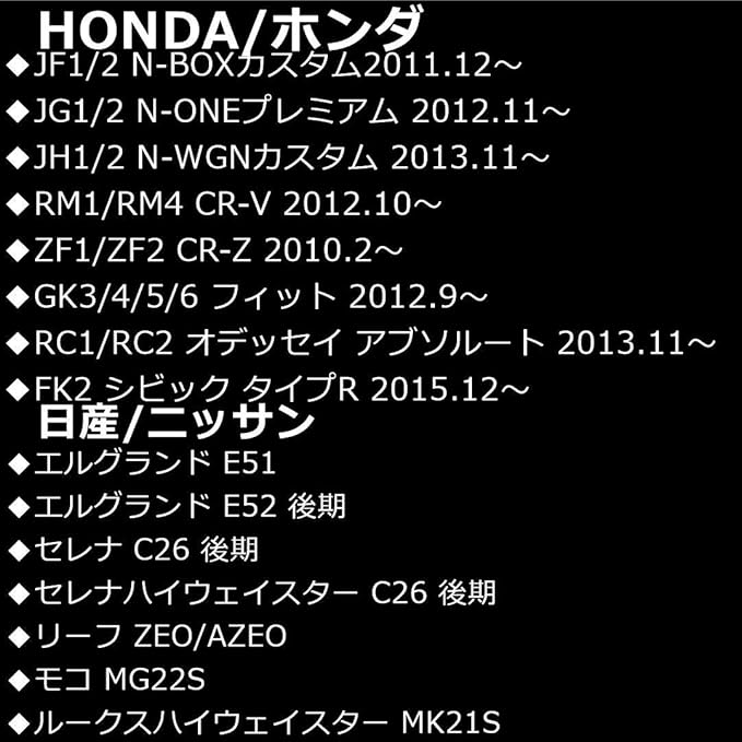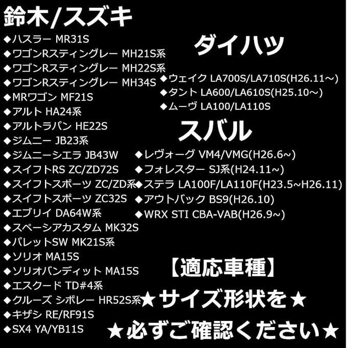 熱に強く美しい強化ガラスレンズを採用! ハロゲンバルブやLEDバルブはもちろんHIDも対応!純正樹脂製レンズに比べて、レンズ変色や劣化しずらくなっております。 スズキ ジムニー JB23 ( '05年10月~の6型以降 ) JB64 車種によってはフォグが2点止めになる場合がありますが、固定には特に問題御座いません。 純正フォグなし車は、フォグカバー、スイッチ等純正部品+加工が必要になります。 =その他参考適合車種= HONDAホンダ ◆JF1/2 N-BOXカスタム2011.12~ ◆JG1/2 N-ONEプレミアム 2012.11~ ◆JH1/2 N-WGNカスタム 2013.11~ ◆RM1/RM4 CR-V 2012.10~ ◆ZF1/ZF2 CR-Z 2010.2~ ◆GK3/4/5/6 フィット 2012.9~ ◆RC1/RC2 オデッセイ アブソルート 2013.11~ ◆FK2 シビック タイプR 2015.12~ 日産ニッサン ◆エルグランド E51 ◆エルグランド E52 後期 ◆セレナ C26 後期 ◆セレナハイウェイスター C26 後期 ◆リーフ ZEO/AZEO ◆モコ MG22S ◆ルークスハイウェイスター MK21S 鈴木スズキ ◆ハスラー MR31S ◆ワゴンRスティングレー MH21S系 ◆ワゴンRスティングレー MH22S系 ◆ワゴンRスティングレー MH34S ◆MRワゴン MF21S ◆アルト HA24系 ◆アルトラパン HE22S ◆ジムニー JB23系 JB64系 ◆ジムニーシエラ JB43W ◆スイフトRS ZC/ZD72S ◆スイフトスポーツ ZC/ZD系 ◆スイフトスポーツ ZC32S ◆エブリイ DA64W系 ◆スペーシアカスタム MK32S ◆パレットSW MK21S系 ◆ソリオ MA15S ◆ソリオバンディット MA15S ◆エスクード TD#4系 ◆クルーズ シボレー HR52S系 ◆キザシ RE/RF91S ◆SX4 YA/YB11S ダイハツ ◆ウェイク LA700S/LA710S(H26.11~) ◆タント LA600/LA610S(H25.10~) ◆ムーヴ LA100/LA110S スバル ◆レヴォーグ VM4/VMG(H26.6~) ◆フォレスター SJ系(H24.11~) ◆ステラ LA100F/LA110F(H23.5~H26.11) ◆アウトバック BS9(H26.10) ◆WRX STI CBA-VAB(H26.9~) など
