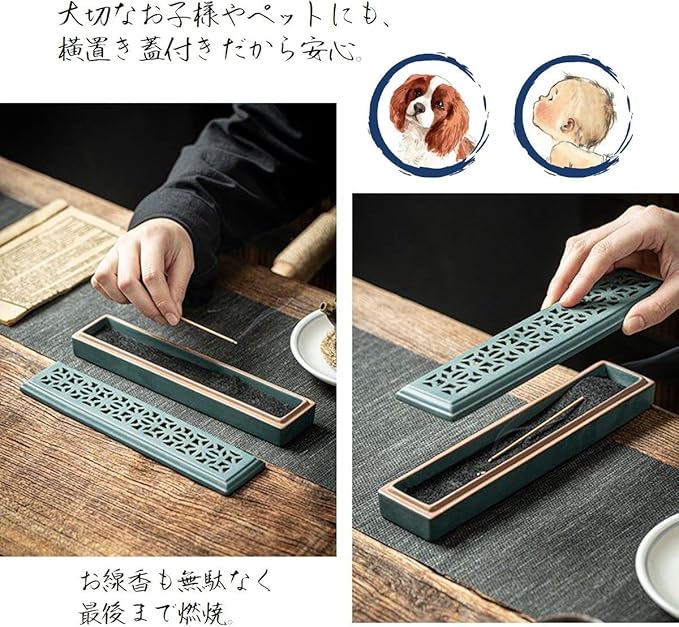 横置きなので灰の舞い上がりや周囲を汚すことも防ぎ、お線香も根本まで無駄なく燃焼します。 陶器製で、火の元の心配もなく置く場所を選びません。 蓋付きで、小さいお子様やペットがいるご家庭でも安心。 本体・防火フェルトともに水洗いもできるため、衛生的です。
