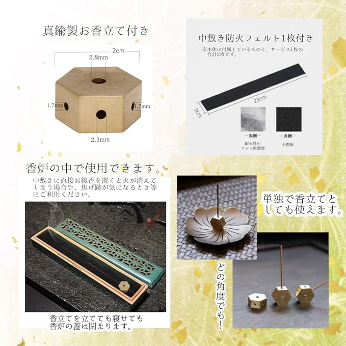 使用方法:耐火綿を平らにし 線香箱に入れ、燃えている線香を耐火綿の上に置き、安全に使用してください。