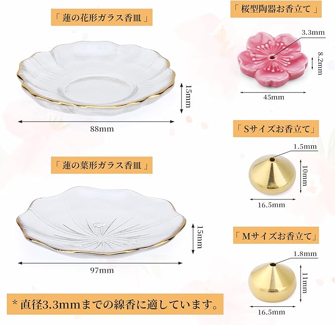【セット内容・仕様】内容物:蓮の葉ガラス製香皿+蓮の花ガラス製香皿+桜型ホルダー+Sサイズ真鍮水滴ホルダー+Mサイズ真鍮水滴ホルダー+箒 蓮の葉香皿サイズ:88mm*15mm 蓮の花香皿サイズ:97mm*15mm 桜ホルダーサイズ:約外径寸法 45mm 内径寸法:3.3mm Sサイズ真鍮水滴ホルダー:約外径寸法 16.5mm*10mm 内径:1.5mm Mサイズ真鍮水滴ホルダー:約外径寸法 16.5mm*11mm* 内径:1.8mm