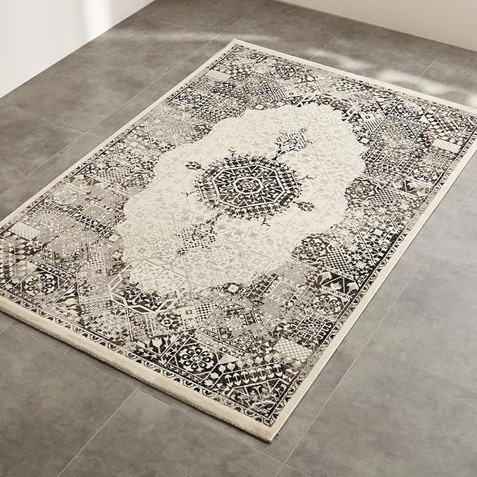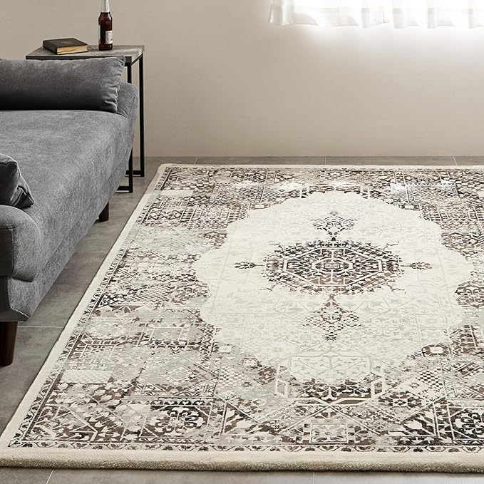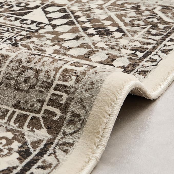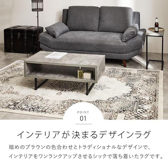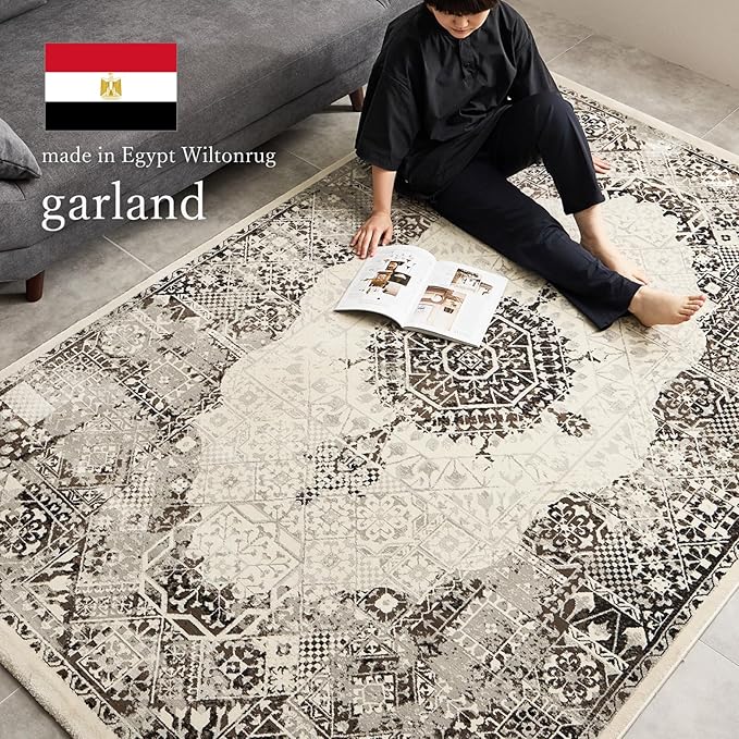 ベージュをベースにダークブラウンで描かれたトラディショナルな柄がシックで落ち着いた雰囲気のウィルトンラグ。オリエンタルなスタイルはもちろん、ヴィンテージ風などさまざまなインテリアにマッチします。