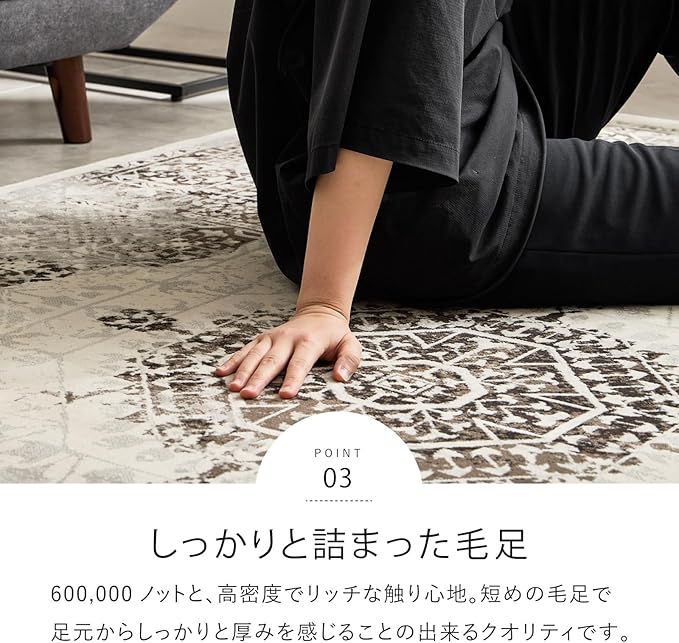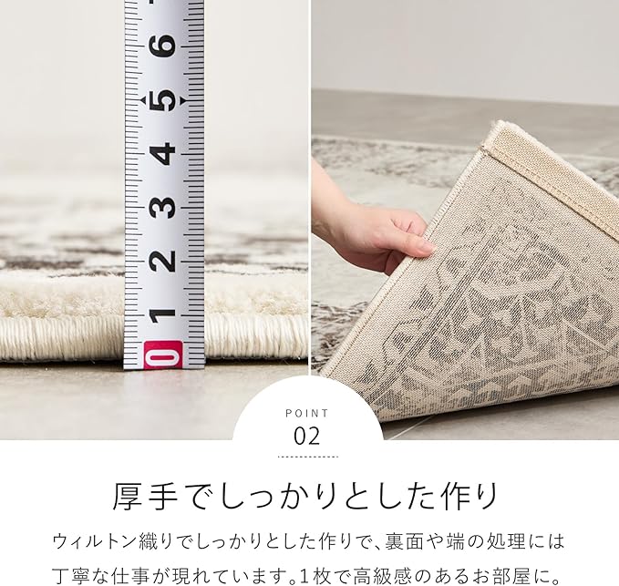 しっかりと織り上げられた厚みのあるウィルトン織りなので、ラグに直接座っても底付き感なく心地よくお過ごしいただけます。