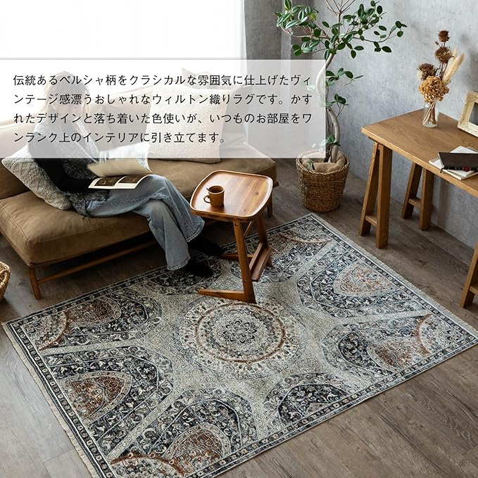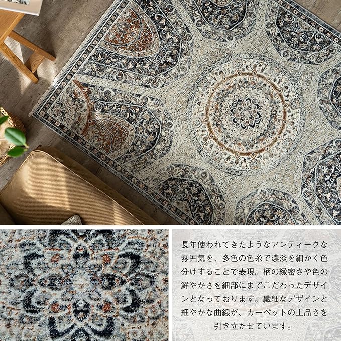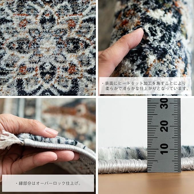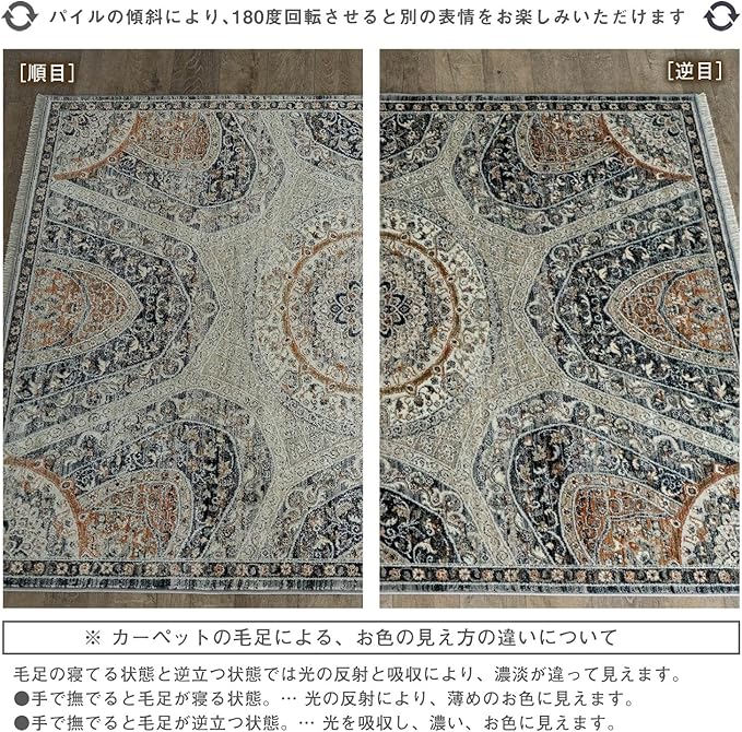 【輸入カーペットを安心してご利用いただくためのお願い】 ●輸入ラグに関して ※同じ商品でも製造ロットの違いによって、サイズや、色味、柄模様の左右が反転していたり、位置がズレている場合がございます。ただし、現地の工場や倉庫での検品をクリアした商品を輸入しています。あらかじめご了承くださいませ。/ ●においに関して ※ご使用当初、裏面に塗られる仕上げの接着塗料(ラテックス剤)のにおいがする場合がございます。人体への影響はありませんが、においに敏感の方や、ご心配の方はご理解の上ご購入お願いいたします。開封後常温のもとで気化(蒸発)するため、においはご使用につれてなくなります。気になる場合は風通しの良いところで陰干ししていただきますと、より早く解消されます。/ ●サイズに関して ※カーペットの製法上、表示サイズより 0~4% の誤差がございます。/ ※いずれも商品の初期不良ではございませんので返品・交換は行なっておりません。(※お客様で返品の送料ご負担によるキャンセルは、返品規定に基づきお受けさせていただきます。)/ ※裏面の製品シールは剥がさないでご使用ください。