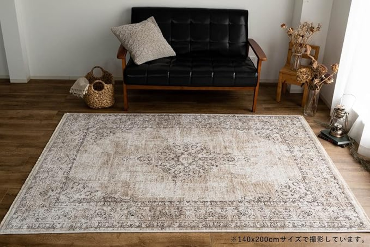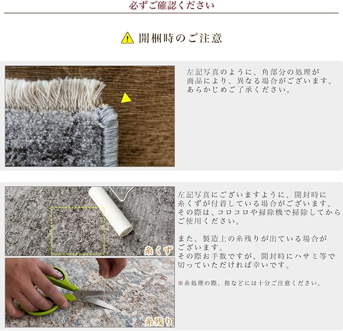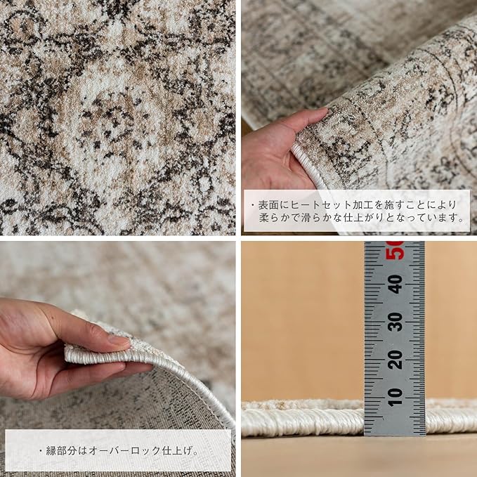 【輸入カーペットを安心してご利用いただくためのお願い】 ●輸入ラグに関して ※同じ商品でも製造ロットの違いによって、サイズや、色味、柄模様の左右が反転していたり、位置がズレている場合がございます。ただし、現地の工場や倉庫での検品をクリアした商品を輸入しています。あらかじめご了承くださいませ。/ ●においに関して ※ご使用当初、裏面に塗られる仕上げの接着塗料(ラテックス剤)のにおいがする場合がございます。人体への影響はありませんが、においに敏感の方や、ご心配の方はご理解の上ご購入お願いいたします。開封後常温のもとで気化(蒸発)するため、においはご使用につれてなくなります。気になる場合は風通しの良いところで陰干ししていただきますと、より早く解消されます。/ ●サイズに関して ※カーペットの製法上、表示サイズより0~3%の誤差がございます。/ ※いずれも商品の初期不良ではございませんので返品・交換は行なっておりません。(※お客様で返品の送料ご負担によるキャンセルは、返品規定に基づきお受けさせていただきます。)/ ※裏面に製品シールが貼っている場合は剥がさないでご使用ください。