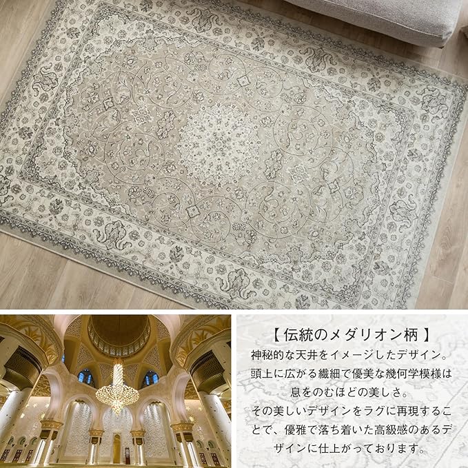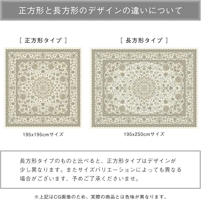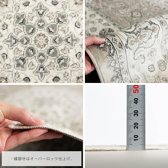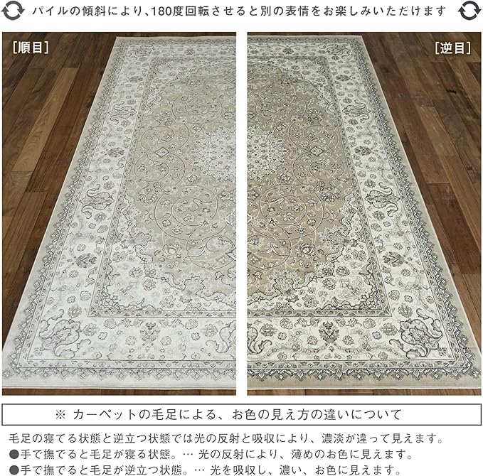 【輸入カーペットを安心してご利用いただくためのお願い】 ●輸入ラグに関して ※同じ商品でも製造ロットの違いによって、サイズや、色味、柄模様の左右が反転していたり、位置がズレている場合がございます。ただし、現地の工場や倉庫での検品をクリアした商品を輸入しています。あらかじめご了承くださいませ。/ ●においに関して ※ご使用当初、裏面に塗られる仕上げの接着塗料(ラテックス剤)のにおいがする場合がございます。人体への影響はありませんが、においに敏感の方や、ご心配の方はご理解の上ご購入お願いいたします。開封後常温のもとで気化(蒸発)するため、においはご使用につれてなくなります。気になる場合は風通しの良いところで陰干ししていただきますと、より早く解消されます。/ ●サイズに関して ※カーペットの製法上、表示サイズより0~3%の誤差がございます。/ ※いずれも商品の初期不良ではございませんので返品・交換は行なっておりません。(※お客様で返品の送料ご負担によるキャンセルは、返品規定に基づきお受けさせていただきます。)/ ※裏面の製品シールは剥がさないでご使用ください。