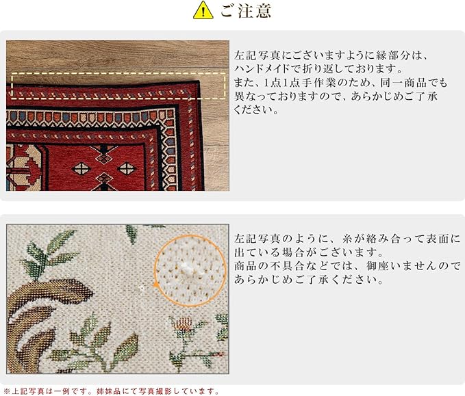 【ご注意】・ご使用当初、少し遊び毛が出ますが、ご使用するにつれ出にくくなっていきます。・滑りやすい場所でのご使用は、市販のカーペット用の滑り止めネットのご使用をお勧めします。・縁部分はハンドメイドで折り返しているため、真っ直ぐではありません。・糸が絡みあって表面に出ている場合がございます。商品の不具合ではございませんのでご了承ください。・1点1点手作業のため、同一商品でも異なっております。・時折、残糸などが出ていることがありますが、ひっぱらずにハサミ等で切ってください。・商品の裏面にございますお手入れ方法や注意事項が記載されたシールは、剥がさずにご使用ください。万が一剥がされると、シールの”のり跡”が残るおそれがございます。