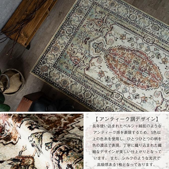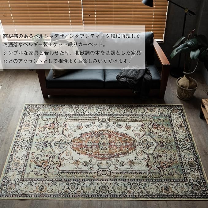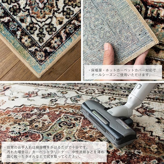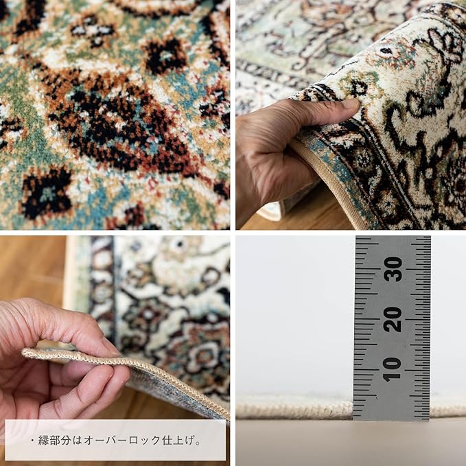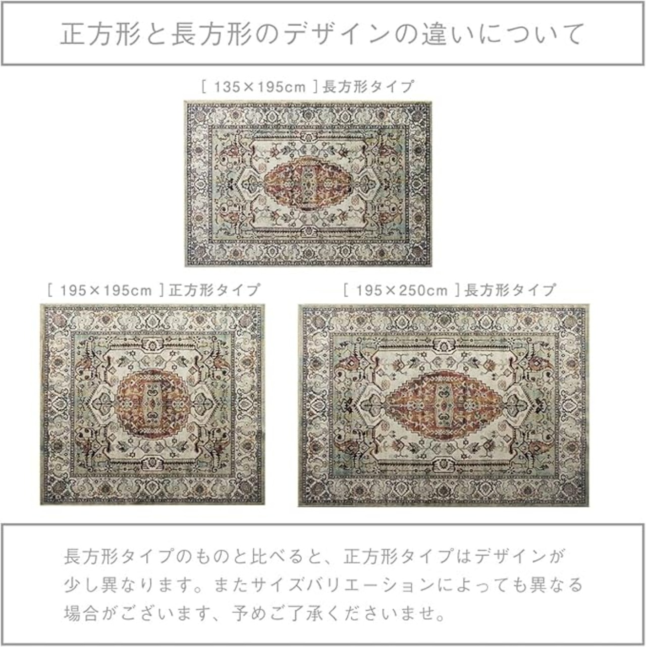 【輸入カーペットを安心してご利用いただくためのお願い】 ●輸入ラグに関して ※同じ商品でも製造ロットの違いによって、サイズや、色味、柄模様の左右が反転していたり、位置がズレている場合がございます。ただし、現地の工場や倉庫での検品をクリアした商品を輸入しています。あらかじめご了承くださいませ。/ ●においに関して ※ご使用当初、裏面に塗られる仕上げの接着塗料(ラテックス剤)のにおいがする場合がございます。人体への影響はありませんが、においに敏感の方や、ご心配の方はご理解の上ご購入お願いいたします。開封後常温のもとで気化(蒸発)するため、においはご使用につれてなくなります。気になる場合は風通しの良いところで陰干ししていただきますと、より早く解消されます。/ ●サイズに関して ※カーペットの製法上、表示サイズより0~3%の誤差がございます。/ ※いずれも商品の初期不良ではございませんので返品・交換は行なっておりません。(※お客様で返品の送料ご負担によるキャンセルは、返品規定に基づきお受けさせていただきます。)/ ※裏面の製品シールは剥がさないでご使用ください。
