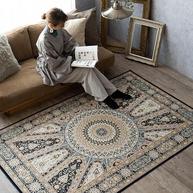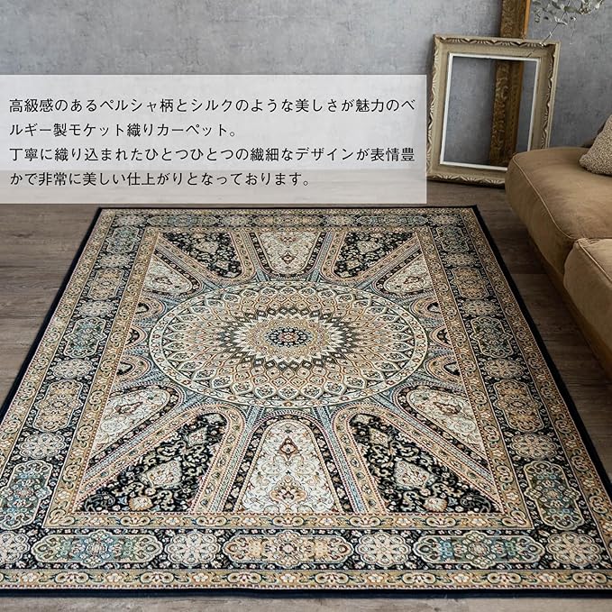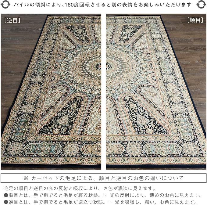 【輸入カーペットを安心してご利用いただくためのお願い】 ●輸入ラグに関して ※同じ商品でも製造ロットの違いによって、サイズや、色味、柄模様の左右が反転していたり、位置がズレている場合がございます。ただし、現地の工場や倉庫での検品をクリアした商品を輸入しています。あらかじめご了承くださいませ。/ ●においに関して ※ご使用当初、裏面に塗られる仕上げの接着塗料(ラテックス剤)のにおいがする場合がございます。人体への影響はありませんが、においに敏感の方や、ご心配の方はご理解の上ご購入お願いいたします。開封後常温のもとで気化(蒸発)するため、においはご使用につれてなくなります。気になる場合は風通しの良いところで陰干ししていただきますと、より早く解消されます。/ ●サイズに関して ※カーペットの製法上、表示サイズより0~3%の誤差がございます。/ ※いずれも商品の初期不良ではございませんので返品・交換は行なっておりません。(※お客様で返品の送料ご負担によるキャンセルは、返品規定に基づきお受けさせていただきます。)