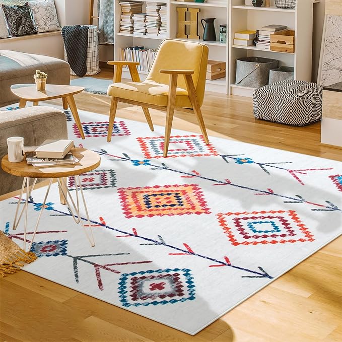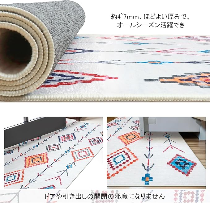 【カラフルなデザイン】さまざまなスタイルのパターンからお選びいただけます。民族風幾何パターンが目を引きます。白地に、赤色、青色、オレンジ色などの菱形や矢印、小花模様がバランス良く。伝統と現代が融合し、シンプルで個性的。先端印刷技術で平織り生地に繊細画像をプリントし、上品さを演出。端はオーバーロック加工、角は細いパイピングで、耐久性と軽やかな印象を兼ね備えます。