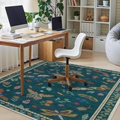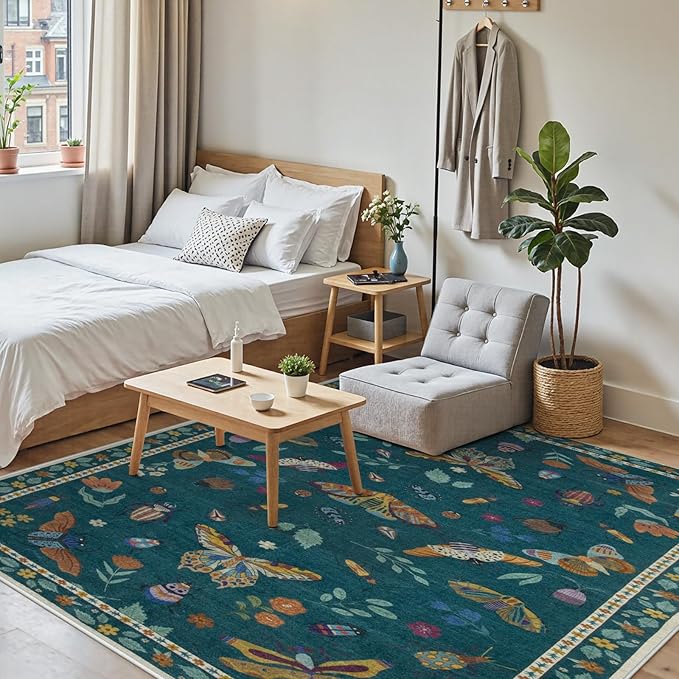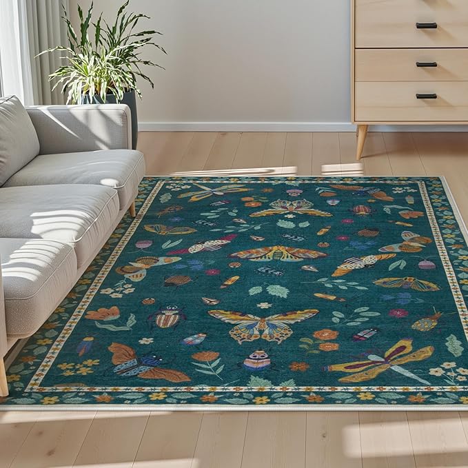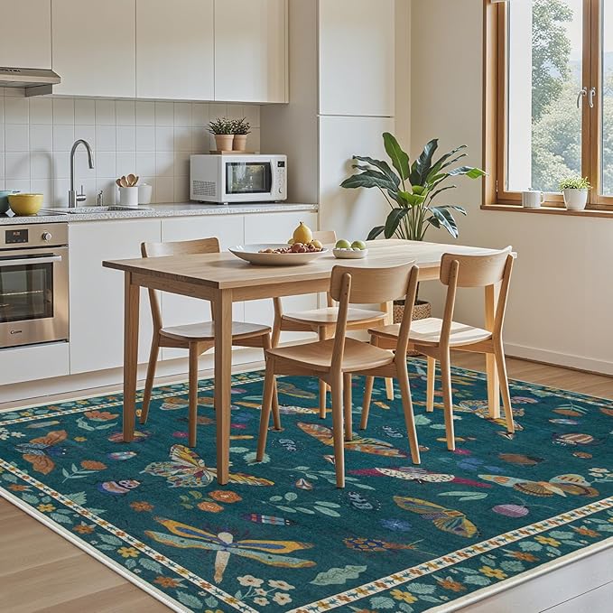 HAOCOO カーペット 洗える 185х185cm 薄手 ラグ 2畳 モダン モダン ふわふわ 滑り止め 防音 抗菌防臭 室内用 正方形 ラグマット オールシーズン適用 花 蝶 トンボ 昆虫 動物柄 ダークグリーン