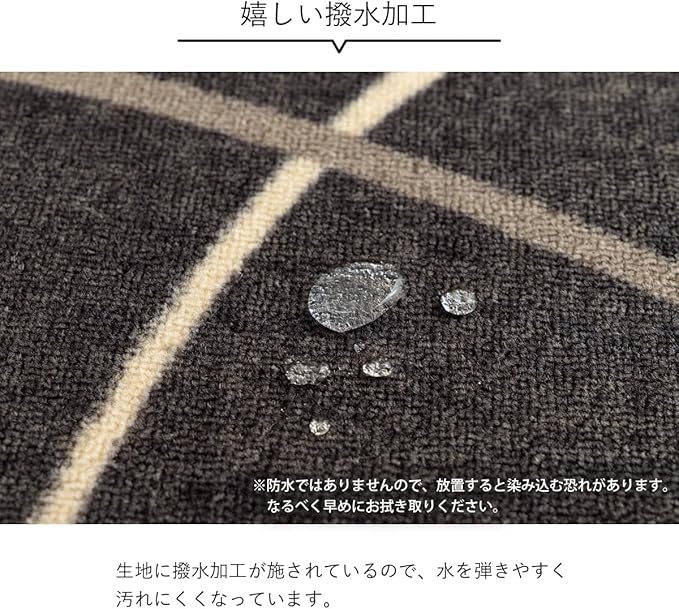 【商品紹介】表地に撥水加工を施しているので、水分をこぼしてもサッと拭けてお手入れ簡単。裏面は不織布だから学習机や椅子の移動も安心。床の傷防止に必要なアイテムです。表面はループタイプで毛足が短いので、ゴミもたまりにくくお手入れも簡単。またポリプロピレン糸を使用しているから摩擦に強く、毛玉が出にくいのも特徴です。