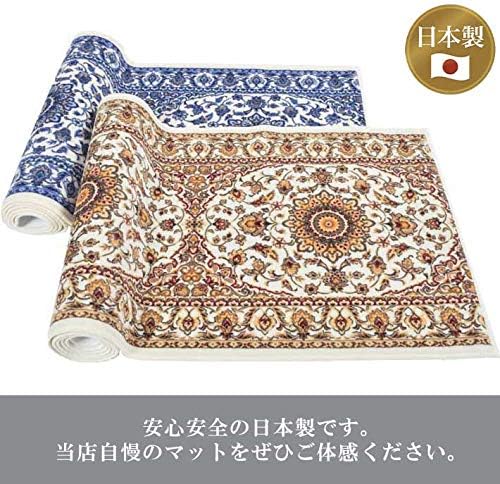 【特徴】繊細なタッチの豪華な模様が高級感を演出してくれる日本製廊下敷きカーペットです。【すべり止め】マットの裏面には、不織布に合成ゴム(ホットメルト)を溶着しているので、滑りにくく安全です。 別途、滑り止めシートをお求め頂く必要はございません。
