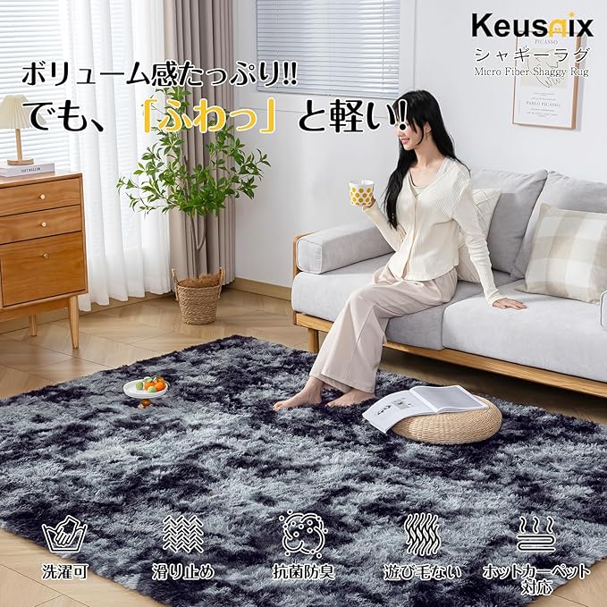 Keusnix ラグ カーペット ラグマット ふわふわ シャギーラグ 200x250cm 絨毯 滑り止め付 洗える 肌触り優しい 防ダニ 抗菌 防臭 オールシーズン快適に使用 床暖房 ホットカーペット対応 ブラックグレー