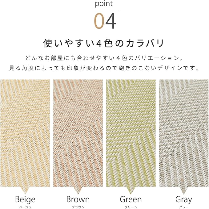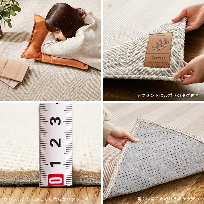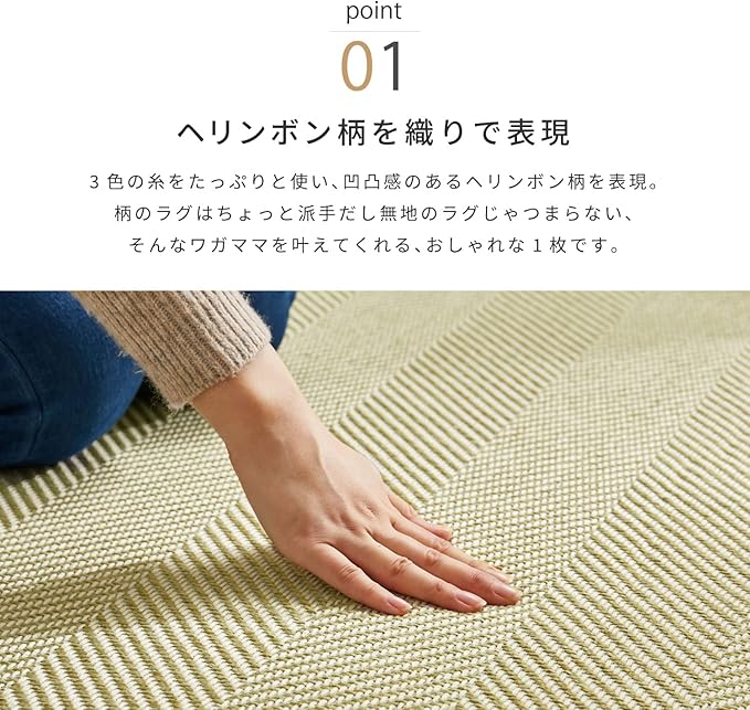 おしゃれなヘリンボン柄を織りで再現した洗えるラグ。ベーシックなカラーリングでどんなお部屋にも合わせやすいデザインです。無地のラグはちょっと物足りないけど柄のラグは抵抗がある… そんな方にもおすすめです。