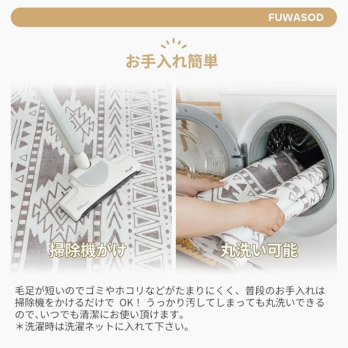 【お手入れ楽々】毛足が短いのでゴミやホコリなどがたまりにくく、普段のお手入れは掃除機をかけるだけでOK!うっかり汚してしまっても丸洗いできるので、いつでも清潔にお使い頂けます。ペットがいるご家庭にもおすすめです。また、重さが軽く、お部屋の移動や折り畳んでの収納も楽々です。*洗濯時は洗濯ネットに入れて下さい。