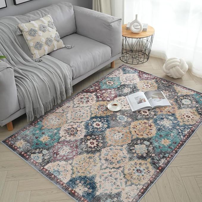 カーペット ラグ マット ペルシャ風 絨毯風 花柄 オールシーズン適用 ボヘミアン柄 滑り止め付き 寝室 リビング 玄関マット 地毯 じゅうたん 洗える 防音マット 防ダニ 防臭 (柄B, 130 180cm)