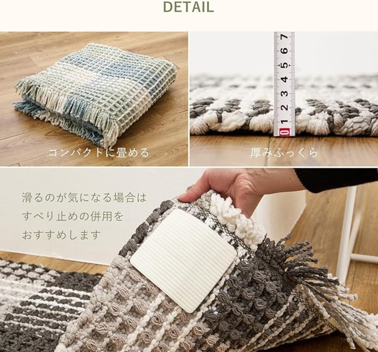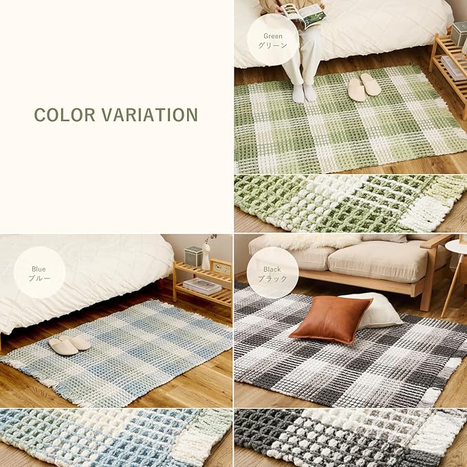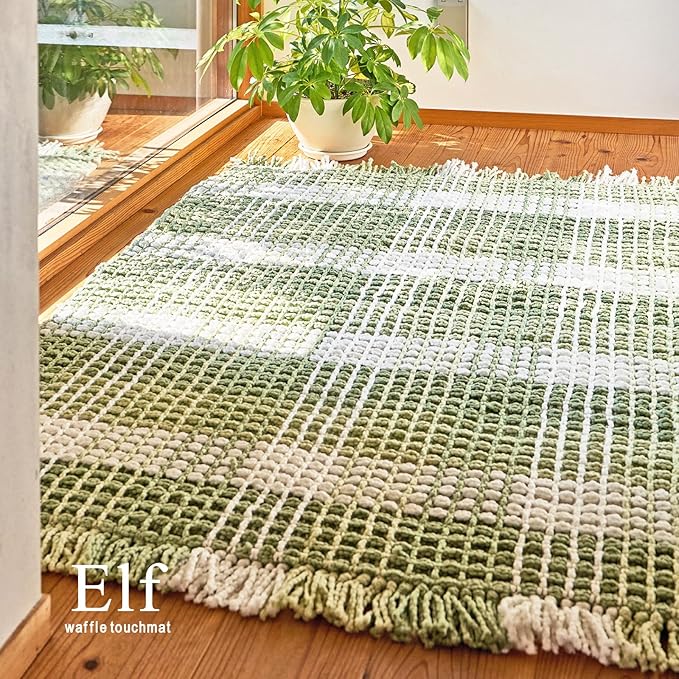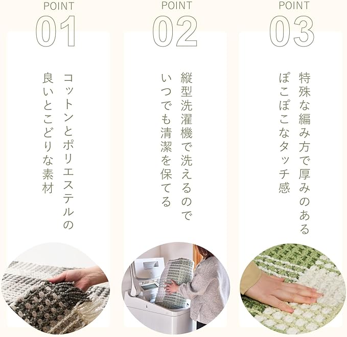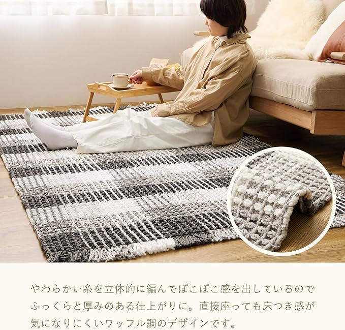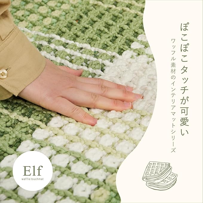 柔らかい糸を立体的に織り上げたワッフル調のラグマットです。綿のさらっとしたタッチ感とポリエステルの乾きやすさを持っており使いやすい一枚です。