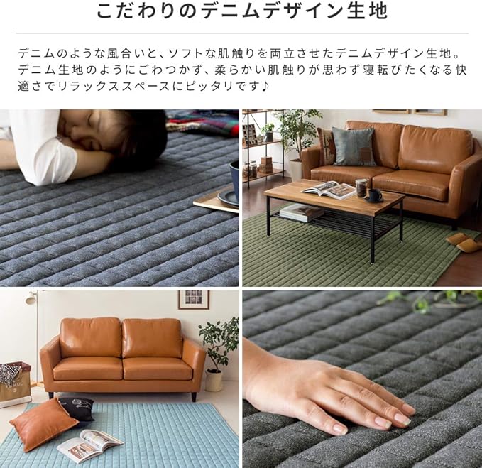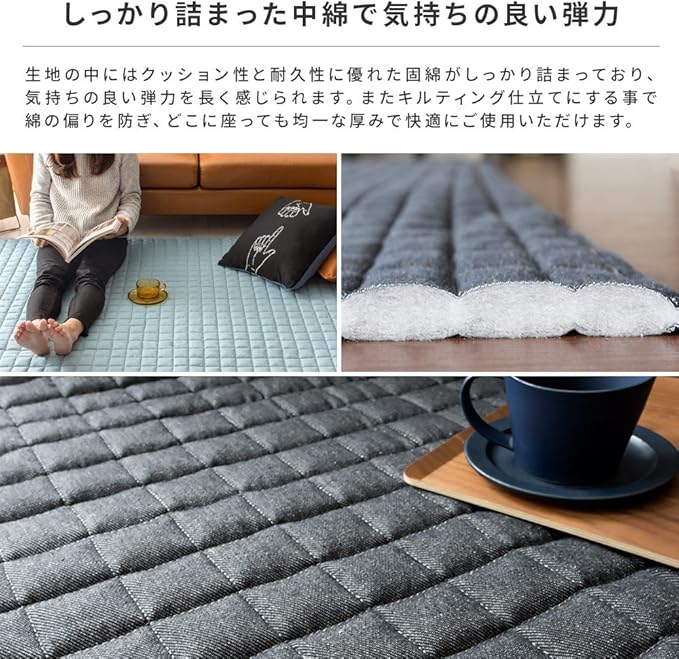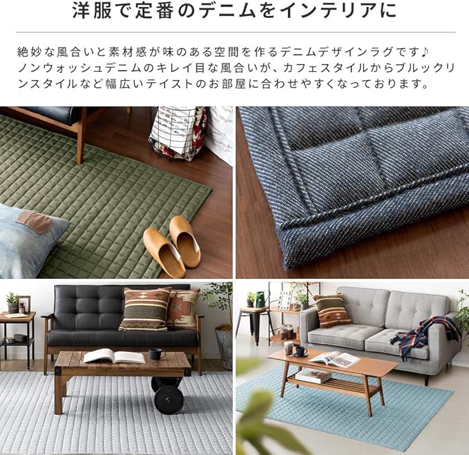 ※デニム素材の特性上、洗濯後に生地が3%~5%程、縮む場合がございます。予めご了承の程、よろしくお願いいたします。※床暖房よっては、ラグ等敷物の使用が不可の場合がございます。床暖房の上で使用される際は、ご購入前に床暖房メーカーへご確認をお願い致します。