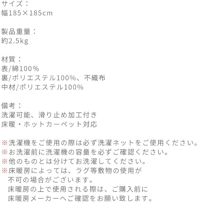 【サイズ】幅185 奥行き185cm 【製品重量】約2.5kg