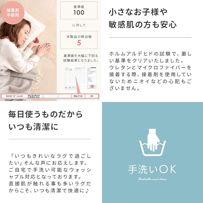 ※ケバが付着致しますので、衣類等と一緒に洗わないで単独で洗濯して下さい。※床暖房よっては、ラグ等敷物の使用が不可の場合がございます。床暖房の上で使用される際は、ご購入前に床暖房メーカーへご確認をお願い致します。