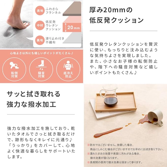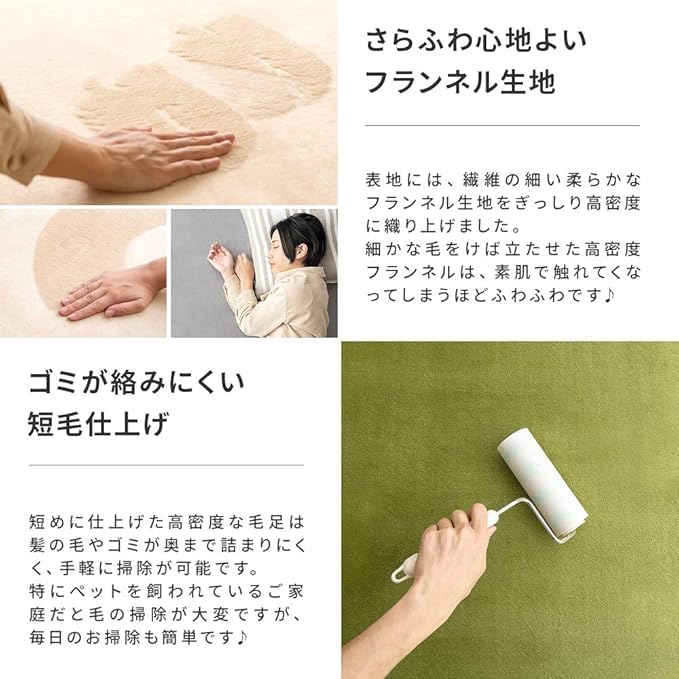 【毛足長さ】約5mm 【備考】撥水加工付き、手洗い可能、床暖・ホットカーペット対応 ※商品の特性上、開梱時には折りジワがついております。ご使用頂いているうちに消えていくものでございますので予めご了承の程お願い致します。