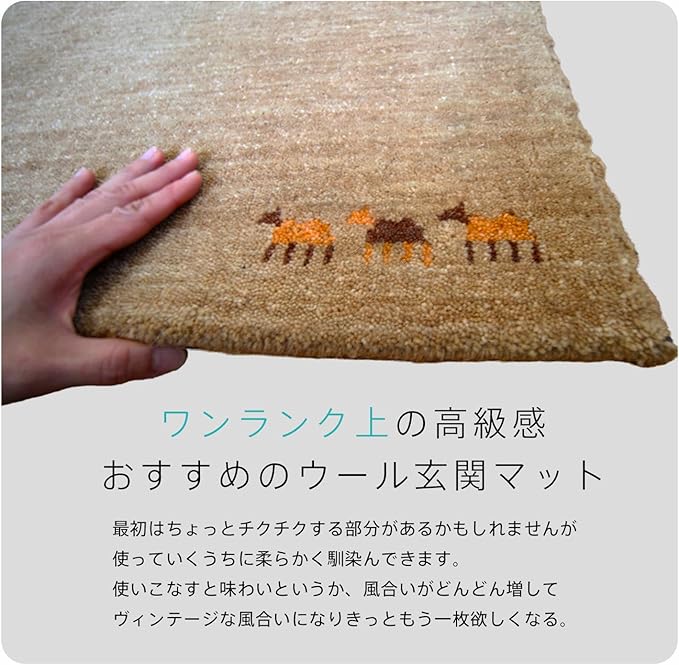 ウール100%のインドギャッベ。ナチュラルなエントランスにピッタリ。新築祝いやプレゼントにも。密度も厚みもしっかりしてるから長持ち。冬だけでなく夏でもベタつかずサラッとした肌触り。