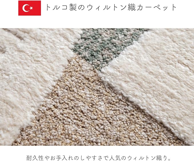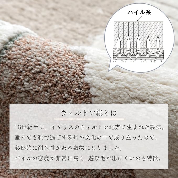 【ポイント①】耐久性やお手入れのしやすさで人気のウィルトン織り。パイルの密度が非常に高く、耐久性があり遊び毛が出にくいのも特徴です。