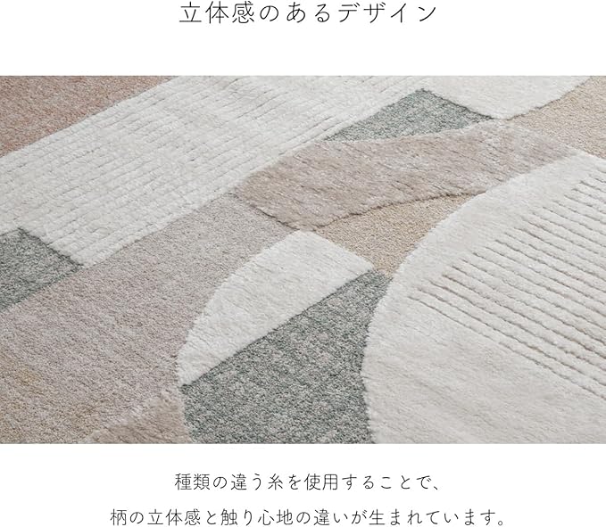 【商品紹介】ニュアンスカラーで幾何学模様を描いた、トルコ製のウィルトンラグ。北欧スタイルなど、色々なテイストに合わせやすいデザインです。種類の違う糸を使用することで、柄の立体感と触り心地の違いが生まれています。
