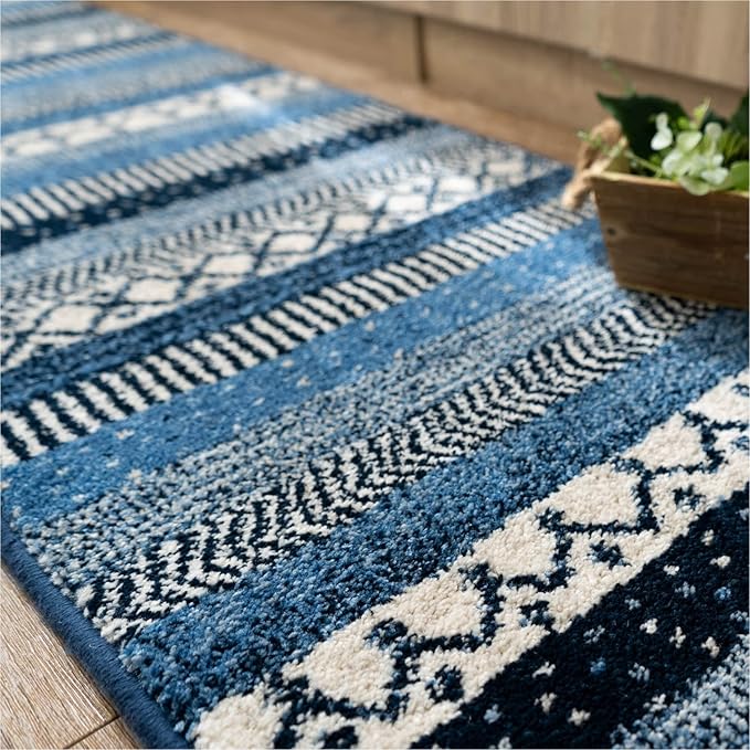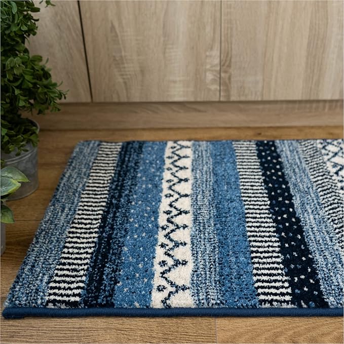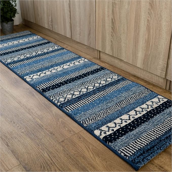 サヤンサヤン ボーダー キッチンマット ジオメトリーラインⅡ50x180 ナチュラルブルー